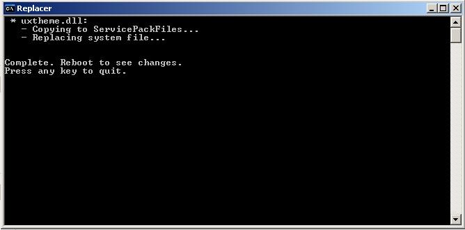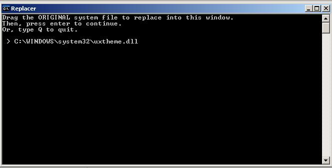 3) Run Replacer.cmd and open c:/windows/system32. Drag uxtheme.dll from system32 folder into Replacer window.Press Enter.