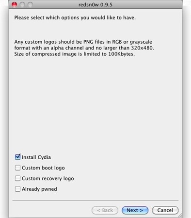 4. Select “Install Cydia” and click next.Jailbreak iPhone 4.0 ios 4.0.1 uing redsn0w redsnow