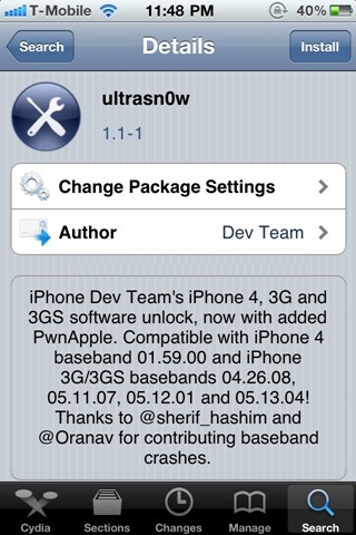 - Open Cydia and search for ultrasn0w. If it is not there, add the repo repo666.ultrasn0w.com and search it again