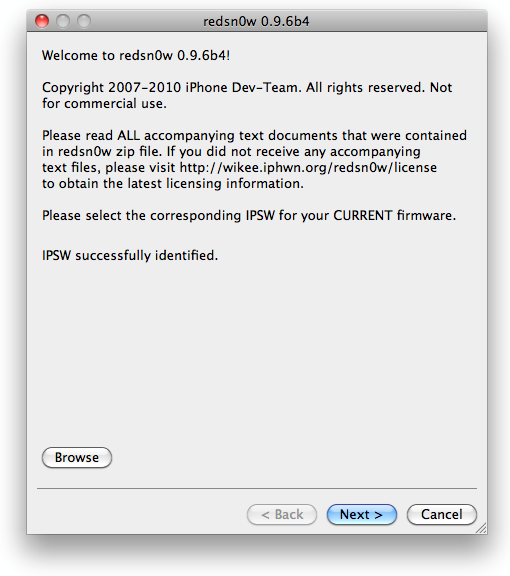- Open redsnow (redsn0w). Browse for the iOS 4.3.1 ipsw file you downloaded in step1. It’ll verify the file. Click next.